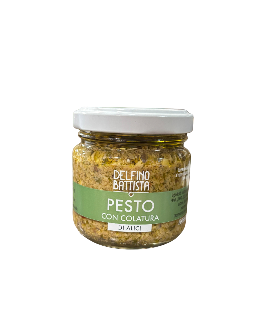colatura di alici, Mandorle, Pinoli, Noci, Alici, olive nere, olive verdi, capperi, olio extravergine di oliva, prezzemolo, basilico, origano, peperoncino, sale. acidificante: E270.